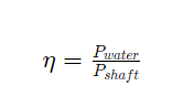 Shaft Power는 축동력으로, Water Power는 수동력으로 볼 수 있습니다. 즉, 펌프의 효율이란 모터에서 발생되어 펌프로 전해진 축동력에 대한 수동력의 비율입니다. 펌프는 결국 유체를 움직이는 기기이며, 물펌프의 경우는 주로 액체인 물을 다루게 됩니다. 따라서, 물에 전달된 운동에너지를 수동력이라고 명명하며 펌프의 효율은 결국 물로 전달되는 동력이 얼마만큼인지를 계산하면 알 수 있습니다.